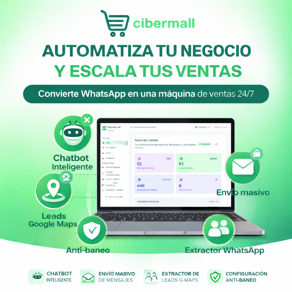 Cibermall es un potente software de automatización de WhatsApp con inteligencia artificial que te permite captar clientes, enviar mensajes masivos y responder automáticamente 24/7. Incluye chatbot inteligente, extractor de leads de Google Maps, extracción de contactos y sistema anti-baneo para campañas seguras.